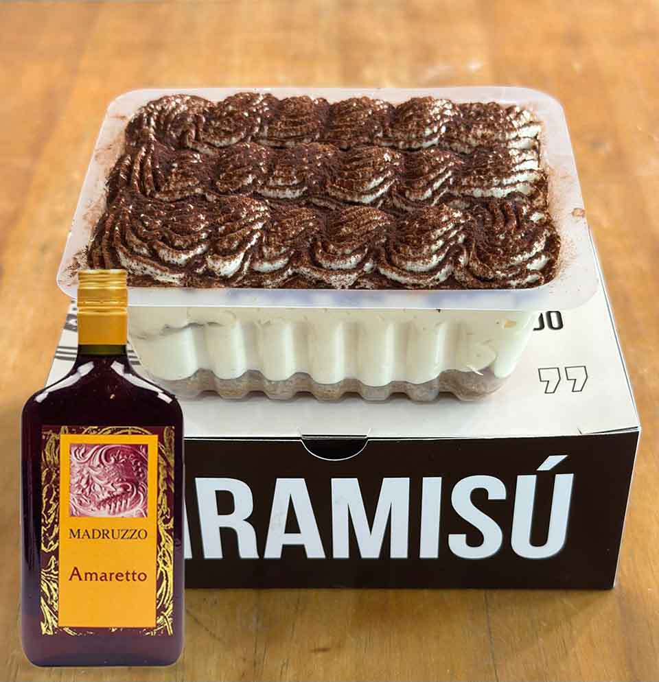 Nuestro tiramisú combina los sabores de mascarpone con licor de amaretto, cafe de y bizcocho espolvoreado de cacao como topping final.